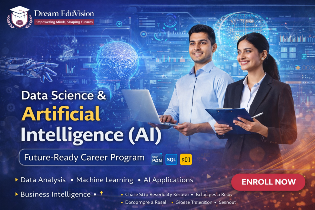 The Data Science & Artificial Intelligence (AI) program at Dream EduVision is designed to prepare learners for high-growth careers in data-driven and AI-powered industries. This program equips students with strong foundations in data analytics, machine learning, artificial intelligence, and business intelligence, enabling them to solve real-world problems using data and intelligent systems.