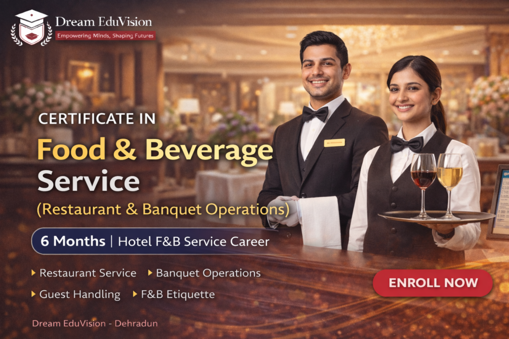 The Certificate in Food & Beverage Service (Restaurant & Banquet) is a 6-month skill-focused program designed to train students in professional restaurant service, banquet operations, guest handling, and service etiquette as per hospitality industry standards. This course prepares learners for service roles in hotels, fine-dining restaurants, banquets, events, and catering operations.